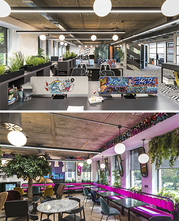 This creative office setup incorporates custom graffiti, exposed textiles, plenty of natural light and quirky furniture.