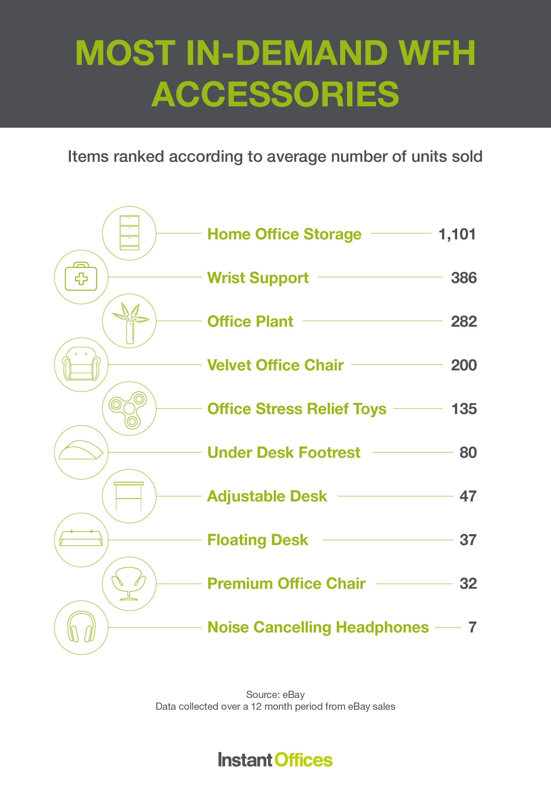 According to the most viewed and sold items on eBay, the most in-demand WFH office furniture and accessories in the last 12 months include home office storage and wrist support, along with plants, ergonomic chairs and stress relief toys.
