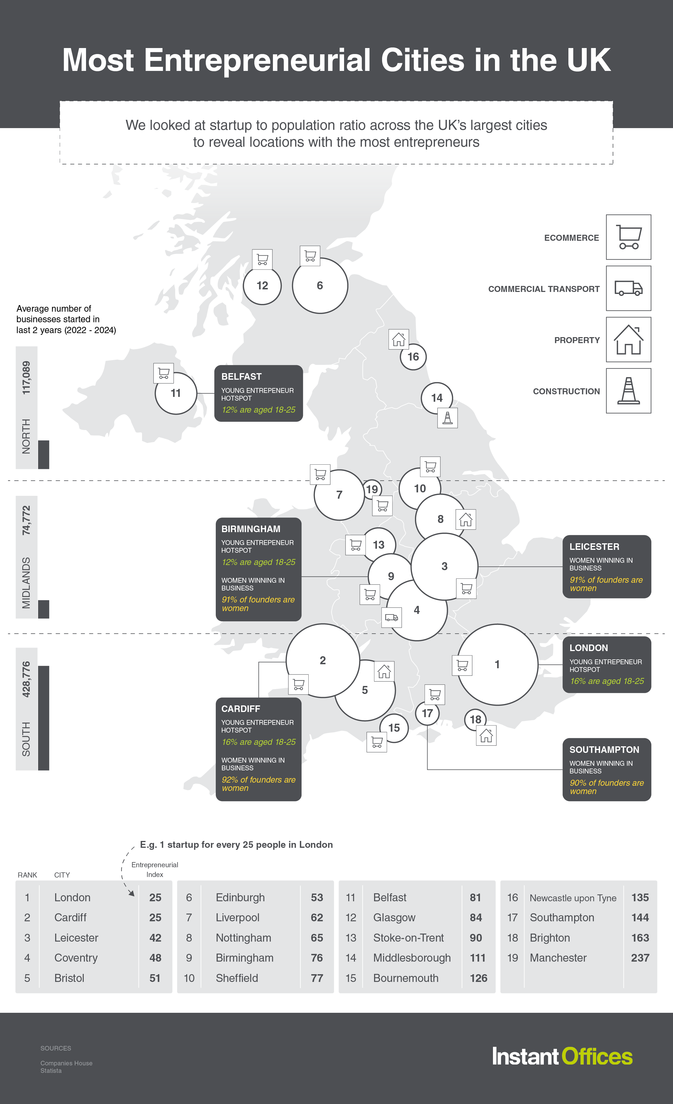 Entrepreneurship in London and Cardiff is strong, with an Entrepreneurial Index of 25, meaning there’s an entrepreneur in every 25 people.