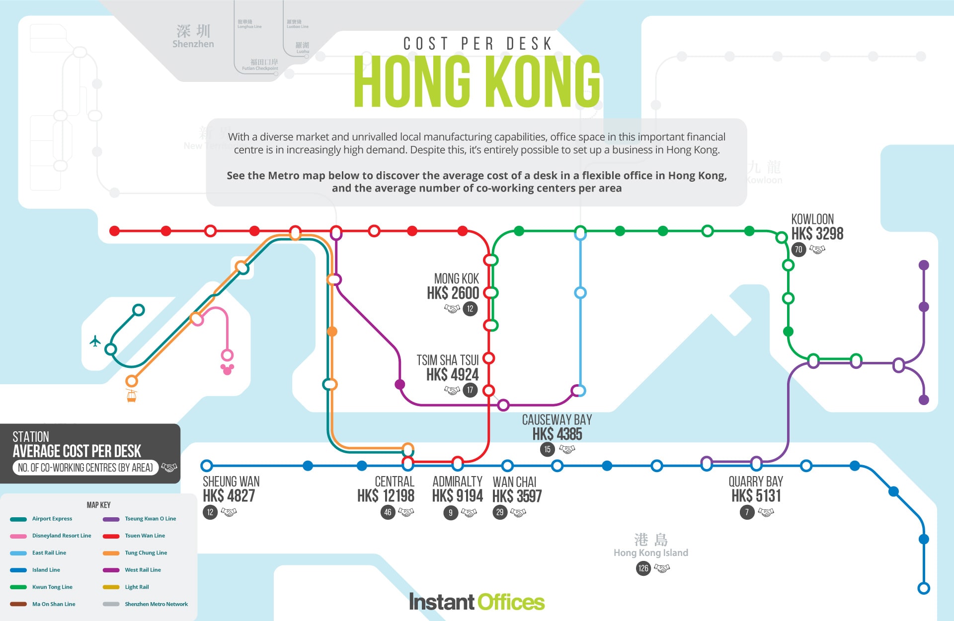 To determine the affordability of SMEs setting up in Hong Kong, Instant has conducted an analysis of major business locations along commuter routes to determine the average cost-per-desk in each area, as well as the number of co-working centres per area.