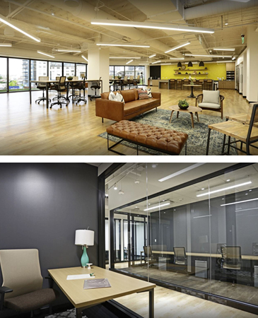 The contemporary workspace has high exposed ceilings with large, floor-to-ceiling windows and an industrial loft design plus a lovely outdoor patio terrace.